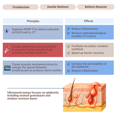 Ultrasound therapy creates acoustic mechanical stress to clean the epidermal microenvironment, reducing inflammation and effectively controlling rosacea.