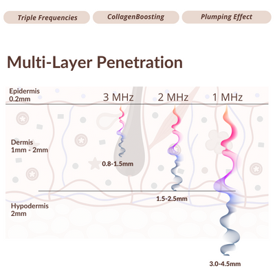 Different frequencies penetrate the epidermis, dermis, and subcutaneous layers, promoting collagen production and providing a plumping effect for a more youthful appearance.