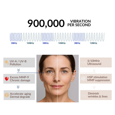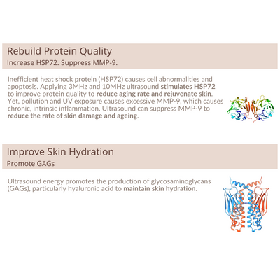 Applying 3MHz +10 MHz ultrasound effectively boosts heat shock protein (HSP72) to reduce protein damage and rejuvenate your skin. Mature signs significantly diminish.
