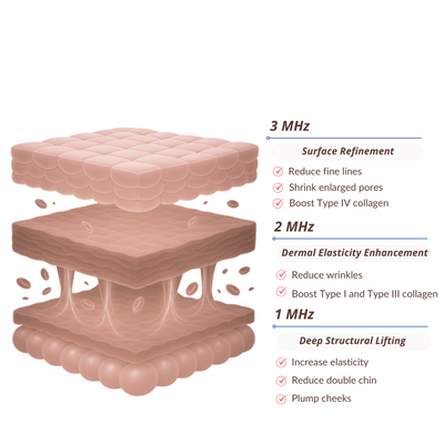 Achieve surface refinement, enhanced dermal elasticity, and structural lifting with 3 MHz, 2 MHz, and 1 MHz frequencies, reducing fine lines, shrinking pores, and boosting collagen.